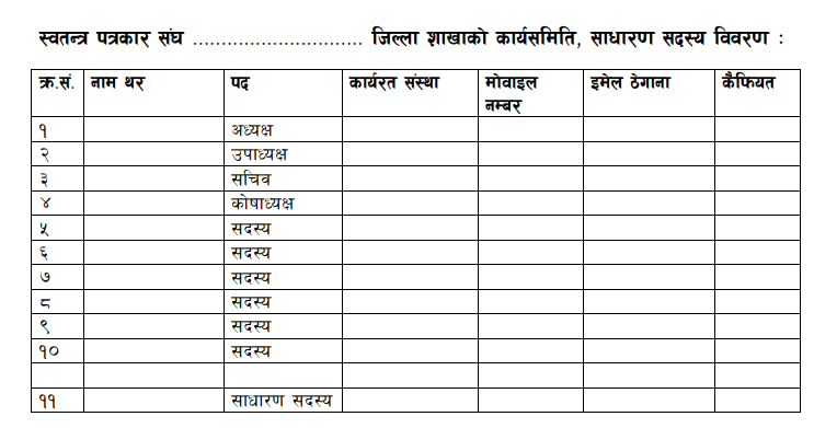 स्वतन्त्र पत्रकार संघ जिल्ला शाखा कार्य समिति तथा साधरण सदस्य फारम विवरण